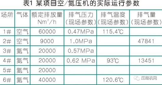 某氧气厂计划改造6台空压机,其中1台60000Nm3/h空压机,1台9000Nm3/h空压机,1台40000Nm3/h氮压机,3台20000Nm3/h氮压机,全部回收末级余热量。通过现场的调研,获取了部分空/氮压机的实际运行参数如表1: