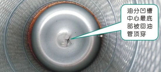 江苏一位同行的一台国产110千瓦空压机跑油,随即更换一只新油分,几天后反映依然跑油。往里面加油,到第二天机器跑油导致高温跳机。该客户和我司销售沟通表示实在没有办法了,想要厂家售后到现场一起处理。笔者到现场和客户拆检机器的时候发现回油管底部顶穿油分底盖,机器当然跑油了。笔者询问现场的售后人员是怎么安装回油管的?售后人员反映说担心回油管插不到油分凹槽底部,向上移位了卡扣再安装的回油管,这就找到了为什么能把油分底盖顶穿了。
