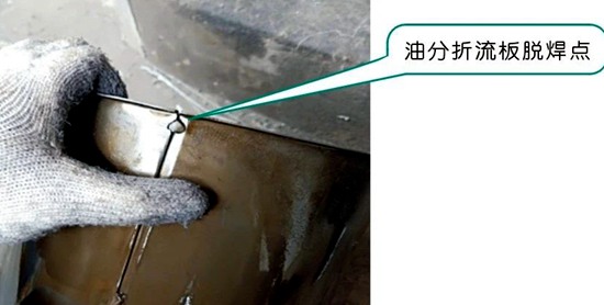 一位天津的空压机同行师傅反映,连续换了两个油分均出现了机器跑油的情况,客户怀疑是同一批次的油分整体出现了问题。因该型号油分已生产销售多年,技术和工艺都相当成熟,并且该品牌的技术配方在行业处于先进水平,是不大可能出现这种批量问题的。带着疑问到了现场,客户因找不到机器跑油原因,正准备再换油分。笔者仔细询问了拆解过程,未见异常,随即让售后师傅把油分桶折流板拆下来仔细查看,折流板上面竟然有脱焊的地方,然后找师傅把脱焊的地方焊接牢固并打磨好,重新安装后机器恢复了正常。