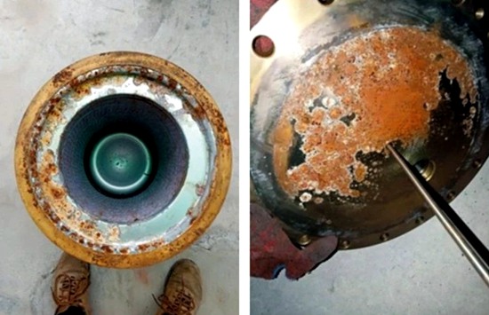 一位杭州萧山同行售后师傅反映一台国产空压机一直存在跑油情况,到达现场时机器正在运行,从储气罐里面放出较多机油,机器油位也明显下降(已到油位镜下标线下方),控制面板上看到机器运行温度只有70度,询问空压机用户的设备管理师傅,他表示机器排气温度还经常处于六十几度,初步判断是机器长期低温运行造成机器跑油。于是协调客户停机,从机器油分桶放油口处放出较多水,拆开油分桶发现油分桶盖下面和油分法兰上面有大量铁锈,进一步验证了机器长期低温运行时过多的水分不能及时蒸发出去是导致机器跑油的根本原因。