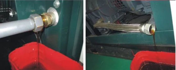 现场如有压缩空气,可将压缩空气接到机头上方进气管道一个阀门出。利用压缩空气压力,将系统中的旧油快速排空及进行吹扫。将软管一头接到油气罐排污阀,一头接到废油桶,打开阀门,放空油气罐旧油。在确保安全的情况下,尽可能在热机状态下放油。