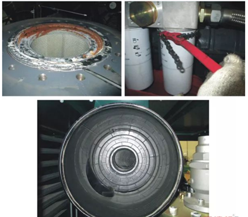 拆除油分离器管路,打开油气分离器,取出油分芯。拆除旧的油滤。更换旧的空滤芯,并对空滤进行清理。