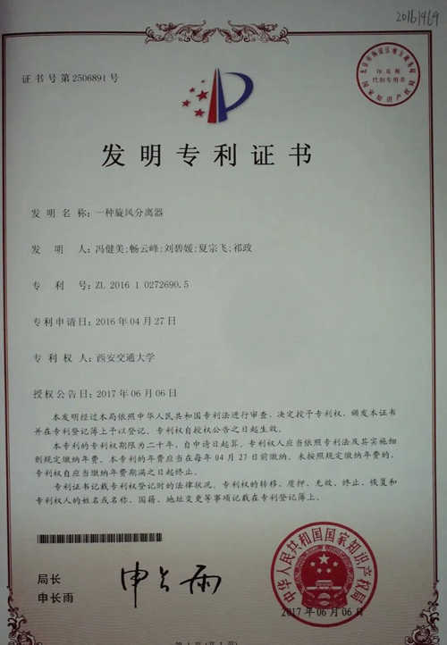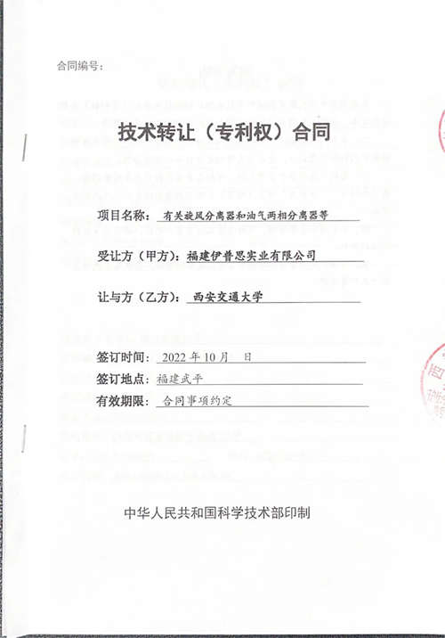 近日,由西安交通大学研发的一种旋风分离器、一种离心式油气分离器等四项发明专利顺利与福建伊普思完成技术与专利权转让合同签署。目前,专利权变更流程正在进行中。