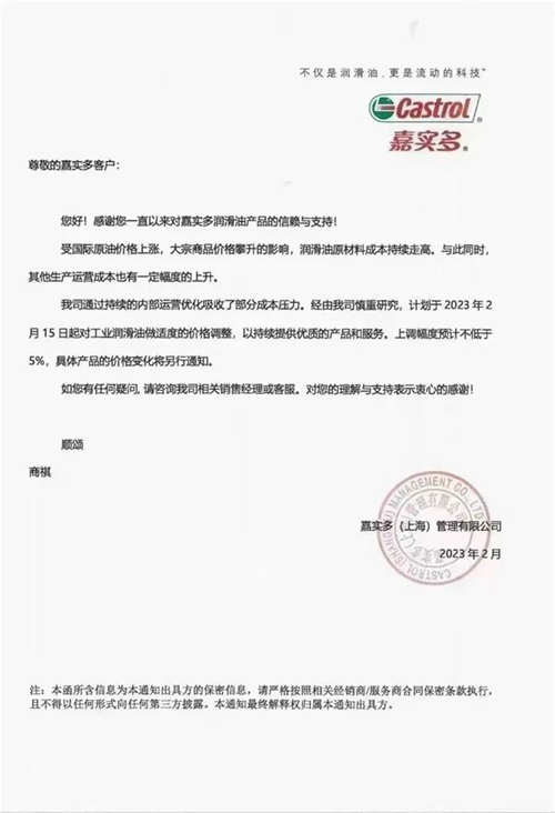 嘉实多在调价函中说:“经由我司慎重研究,计划于2023年2月15日起对工业润滑油做适度的价格调整,以持续提供优质的产品和服务。上调幅度预计不低于5%,具体产品的价格变化将另行通知。”壳牌在《价格说明函》中称,将于2023年3月1日起调整润滑设备相关产品的销售价格,调整后的各产品最新价格将于近期发布。长城润滑油则在《商品价格调整告知函》中表示,2月1日起对金属加工液、柴机油等部分商品的销售价格做适度调整,上调幅度5%以上,后续也将视成本变化情况及时上调其他商品的销售价格。