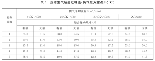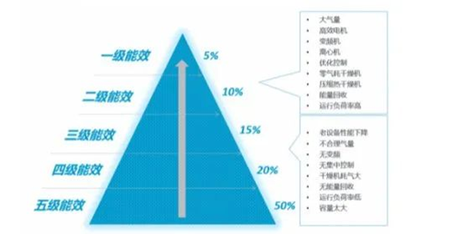 团体标准T/CGMA 033001-2018 规定的压缩空气站综合输功效率指标用于压缩空气站的能效等级评价,能效分为5个等级,其中1级为最优,5级为最差。按照等级设计理念,一级能效标准空压站整体比例不大于5%,实现一级能效不是很容易,需要关注以下几个重要方面: