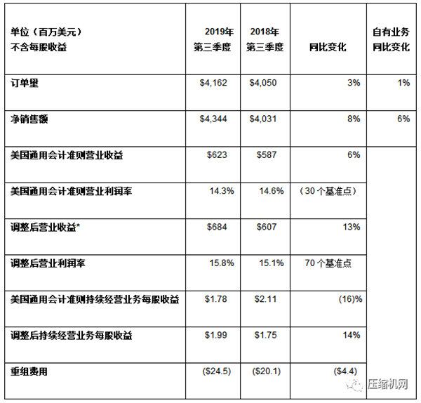 英格索兰(纽交所代码:IR)今日公布,2019 年第三季度公司持续经营业务摊薄每股收益为1.78 美元。调整后持续经营业务每股收益为1.99 美元,不包括主要与持续优化全球运营足迹相关的重组费用2500万美元,以及与预期一致的工业技术业务拆分和并购相关成本3700万美元。