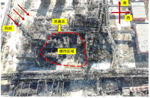 事故管道发生泄漏,在带压密封作业过程中发生断裂,水洗罐内反应流出物大量喷出,与空气混合形成爆炸性蒸气云团,遇点火源爆炸并着火(爆炸区域见图3),造成现场作业、监护及爆炸冲击波波及范围内重大人员伤亡。