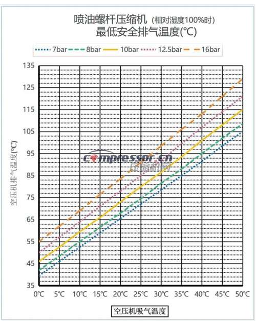 在常压(0.7~0.8MPa)空压机中,排气温度通常在70~90℃之间。尽管理论上等温压缩过程可能比绝热压缩效率更高,但实际中压缩机的最高效率仍略低于绝热压缩。因此,压缩机效率通常与绝热压缩而非等温压缩相比较。如果喷入足够的润滑油并保持低温,排气温度甚至可能低于进气温度。同时,排气温度也有下限要求,以防止压缩后的水蒸气冷凝。在100%相对湿度下,从20℃环境温度压缩到0.8MPa时,饱和温度约为59℃。为防止冷凝水产生,排气温度通常不低于70℃。一旦在系统中出现冷凝水,应将压缩机停车5-6小时,让油与水充分分离并排放水分,否则会使油质恶化并降低润滑油、过滤器、轴承等配件寿命。