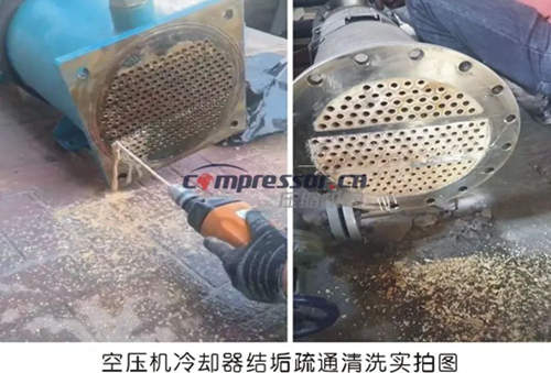 水冷型空压机高温停机造成非正常停机、停产是什么原因呢?答案是冷却器、冷却塔结垢导致换热效率下降,影响冷却效果。常见的解决方法是拆冷却器,药剂浸泡,高压水枪清洗,在线打循环清洗,冲击钻刷子疏通清洗。这样的解决方案往往治标不治本,头疼医头,脚疼医脚,空压机运行三个月左右,还是会出现结垢问题,影响企业正常生产。究其原因是没有抓住问题的症结所在,治理水冷空压机结垢问题应从循环冷却水结垢的机理入手,分析结垢成分。