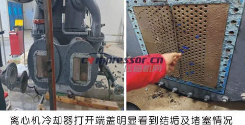 1、山东某化工行业三台315kW水冷型螺杆空压机,采用开式冷却塔降温冷却,和其他生产设备共用一套冷却塔,源水采用地下水作为补充水。化验循环水质,硬度1250mg/l,电导率3680us/cm,PH值8.5,泥沙含量大,结垢频繁,换热器堵塞严重,平均每三个月需拆开换热器清洗一次,夏季更是频繁高温报警,用户苦不堪言。