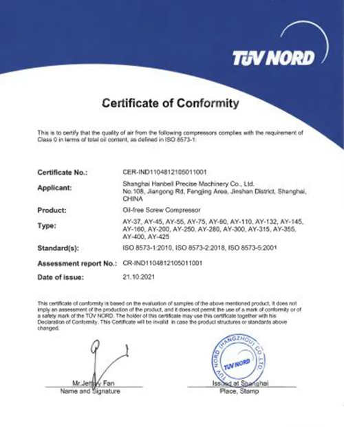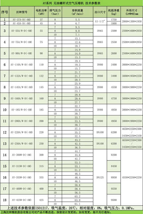 汉钟精机空压机组事业部推出新一代AY系列无油螺杆式空气压缩机。37~425kW全系列产品均通过TUV Class 0级无油认证,保障客户更为优质的压缩空气质量,满足用户节能、环保、高可靠性的需求。