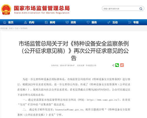 国家市场监督管理总局7月8日发布了《特种设备安全监察条例》的公开征求意见稿的再次公开征求意见的公告