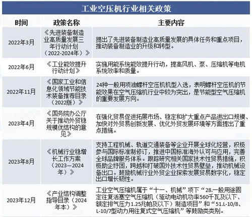 空气压缩机属于国家鼓励发展的节能装备,行业的发展对于国家降低能源消耗、改善环境及实现可持续发展战略目标具有重大意义。近年来国家先后颁布了一系列文件指导和支持本行业,鼓励行业发展,有利于工业空气压缩机行业保持持续发展态势。