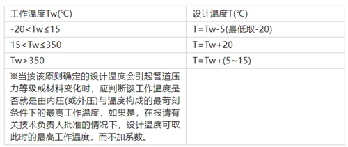 b.对于夹套或外伴热的管道当工艺介质温度高于伴热介质温度时,其设计温度按上表选取;当工艺介质温度低于伴热介质温度时,对夹套伴热取伴热介质温度为设计温度,而对外伴热则取伴热介质温度减10℃与工艺介质温度二者的较大值为设计温度;
