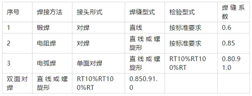 对于存在纵向焊缝和螺旋焊缝的焊接管子及其元件而言,相对于无缝管及其元件,通常会将其机械性能下降的程度用一个强度降低系数(即焊缝系数)来衡量。在工程上,焊缝系数的取值可参考下表: