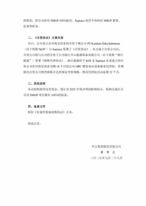 同日,公司下属公司KOI与Supraco签署了《合资协议》,双方将成立合资公司。合资公司将与公司的全资子公司浙江开山能源装备有限公司签署《销售代理协议》。浙江能源给予KOI及Supraco未来成立的合资公司在印度尼西亚为期18个月的公司ORC模块电站设备独家代理权。
