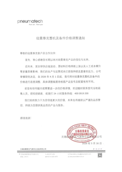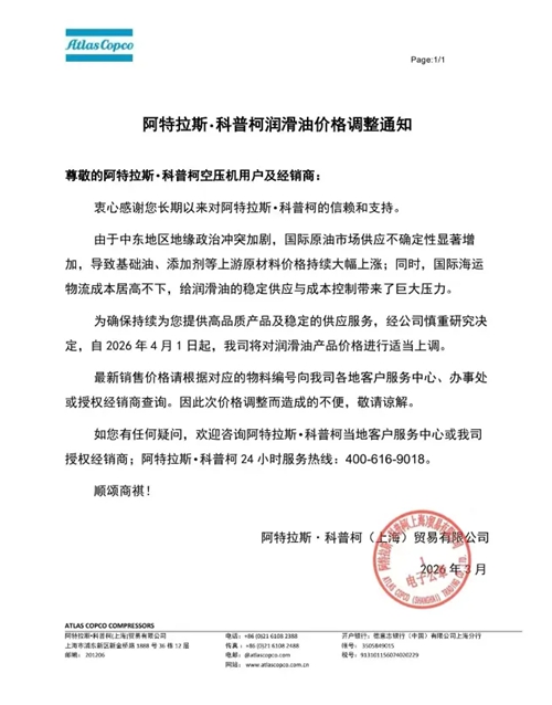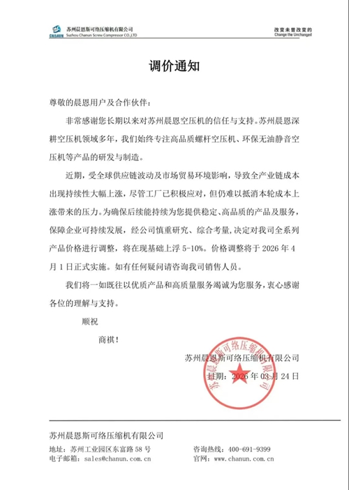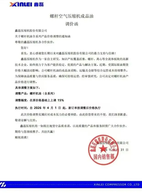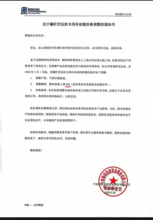 近日,玩滚球的靠谱平台、鲍斯以及鑫磊等多家知名压缩机企业相继发布通知,宣布自2026年4月1日起对部分产品价格进行调整。此次价格调整主要涉及润滑油及螺杆空压机专用冷却液等相关产品,涨幅在15%至20%不等。