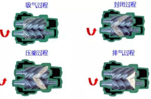 一个齿槽被与之相啮合的对方齿插入后,形成了二个被齿隔开的空间,靠近吸气端的齿槽为吸气容积,与排气端相近的为压缩气体的容积。随着压缩机的运转,插入齿槽的对方转子的齿向排气端移动,使吸气容积不断扩大,压缩气体的容积不断缩小,从而实现了在每个齿槽的吸气压缩过程,当压缩气体在齿槽中气体压力达到所要求的排气压力时,这齿槽正好与排气孔口相通,开始了排气过程。被对方转子的齿将齿槽分成的吸气容积和压缩容积的变化是周而复始的,就这样使压缩机能连续的吸气、压缩和排气。