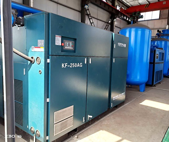 压缩机工作时,空气经过自洁式空气过滤器被吸入,通过PLC自动清洗过滤器,空气在经过进口导叶自动调节后进入一级压缩,经一级压缩后的气体温度较高,然后进入中间冷却器进行冷却(水走管内,气走管外,中冷器的水流量要求为110m/h)之后进入二级压缩系统,为避免系统中的气体倒入压缩腔内(避免带压起动)在压缩机的排气管道安装有一只悬挂全启式止回阀,压缩机排出的气体推开止回阀进入排气消声器,然后进入一级后冷器,二级后冷器,再进入排气主管道。