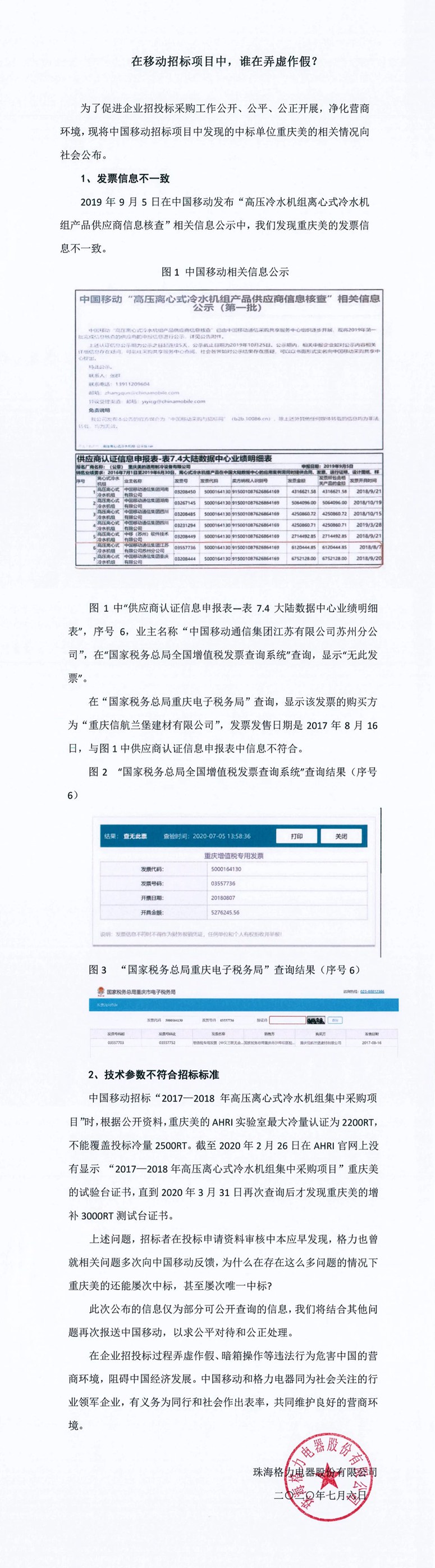 为了促进企业招投标采购工作公开、公平、公正开展,净化营商环境,现将中国移动招标项目中发现的中标单位重庆美的相关情况向社会公布。