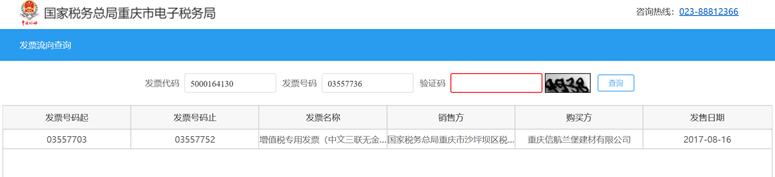 在“国家税务总局重庆电子税务局”查询,显示该发票的购买方为“重庆信航兰堡建材有限公司”,发票发售日期是2017年8月16日,与图1中供应商认证信息申报表中信息不符合。