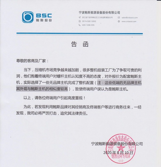 8月10日,宁波鲍斯能源装备股份有限公司发布告函,称近期有很多整机组装工厂为了争取利润,他们抱着终端用户对螺杆主机认知度不高的态度,对外报价为鲍斯主机,实际却选择了一些无品牌主机完成了整机的配置,而且这些低端的无品牌的主机外观与鲍斯主机相似度极高,致使终端用户误认为是鲍斯主机,这大大损害了鲍斯在市场的品牌形象及合法权益,也损害了官大终端用户的利益。