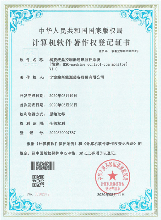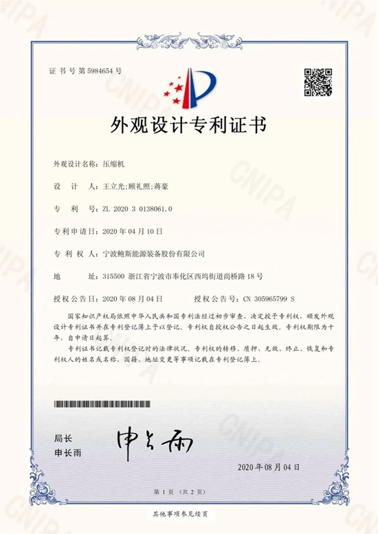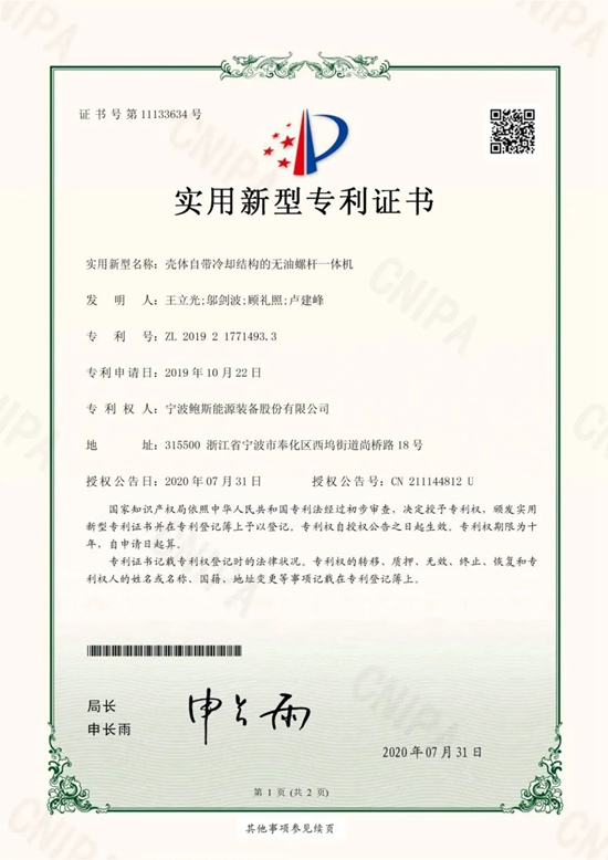 近日,鲍斯又喜获一项“壳体自带冷却结构的无油螺杆一体机”实用新型专利证书、“压缩机(涡旋式)”、“压缩机”两项外观设计专利证书以及“涡旋液晶控制器通讯监控系统”计算机软件著作登记权证书。