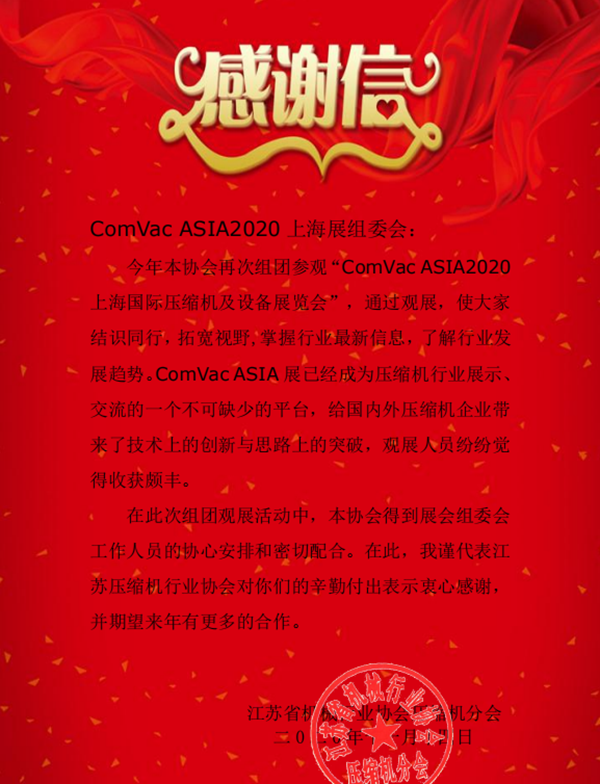 在此次组团观展活动中,本协会得到展会组委会工作人员的协心安排和密切配合。在此,我谨代表江苏压缩机行业协会对你们的辛勤付出表示衷心感谢,并期望来年有更多的合作。