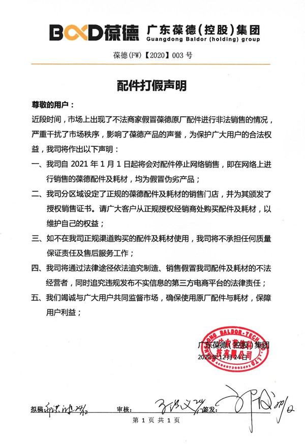 近段时间,市场上出现了不法商家假冒葆德原厂配件进行非法销售的情况,严重干扰了市场秩序,影响了葆德产品的声誉,为保护广大用户的合法权益,我司将作出以下声明: