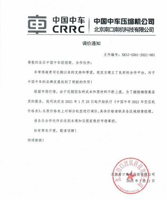 根据市场行情,由于近期因各种成本和原材料不断上涨,为了继续确保高品质的服务,我司决定自2021年1月25日起开始执行《中国中车2021年空压机价格表》,在原价格表上对部分机型进行调价,具体价格请联系各区域销售经理。