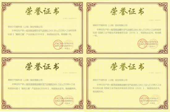会议发布了2020年《国家工业节能技术装备推荐目录》及《“能效之星”产品目录》入围企业名单,并为2019、2020年入围企业发放能效标识及相关证书,德耐尔节能科技(上海)股份有限公司生产的一般用喷油螺杆空气压缩机DAV-90+/7、一般用变频喷油螺杆空气压缩机DAV-132+/7双双入围。