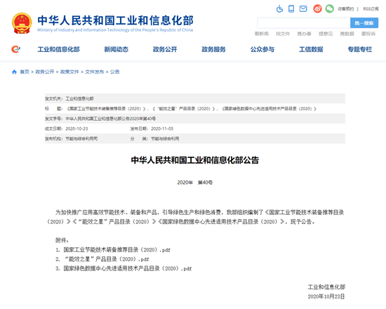 早在2020年10月23日,中华人民共和国工业和信息化部发布的2020年第40号公告:为加快推广应用高效节能技术、装备和产品,引导绿色生产和绿色消费,我部组织编制了《国家工业节能技术装备推荐目录(2020)》《“能效之星”产品目录(2020)》《国家绿色数据中心先进适用技术产品目录(2020)》,现予公告。德耐尔节能科技(上海)股份有限公司两款装备(产品)入选(详见工信部网站公示,2020年10月23日的《国家工业节能技术装备推荐目录(2020)》《“能效之星”产品目录(2020)》公示页面,附件1中第66页、附件2中第24页)。