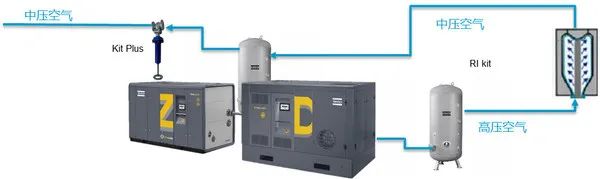 组合使用两种压缩技术,分别应用于其优势压力段。通过Z的无油螺杆技术,可以把压力提高到7~10 bar g,供旋盖、贴标、码垛等中压用气;通过无油活塞的技术,把压力从7~10 bar g 增压到30~40 bar g,满足吹塑工艺的用气压力要求;取代传统繁冗的两套系统装置。