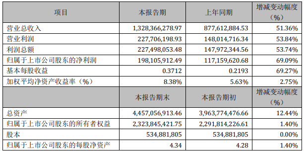 汉钟公司实现营业收入132,836.63万元,较上年同期上升51.36%;实现归属于上市公司股东的净利润19,810.59万元,较上年同期上升69.09%,主要说明如下: