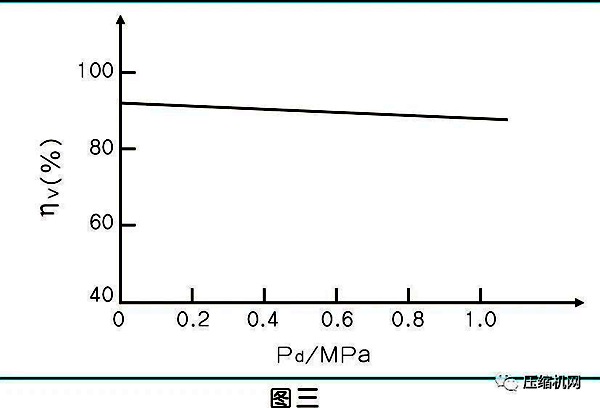 同样排气压力为7bar,单级压缩主机压比为8:1;两级压缩主机头压比为2.8:1。从容积效率来看,压比增大,绝热效率值下降。(见图4)