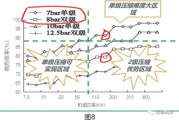 因此针对单级压缩已经很高的绝热效率(如在大功率或高压力机组中),进一步提高绝热效率难度很大,因此采用两级压缩是提高机组能效是最佳方法,特别是在国内主机的技术和制造水平不占优势的情况下实现弯道超车,也是当今市场普遍的操作。