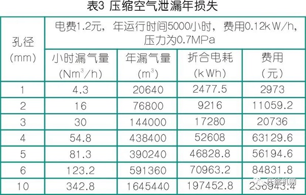 例:当孔径为3mm,管内空气的绝对压力为0.5MPa时,每小时的泄漏空气量为: