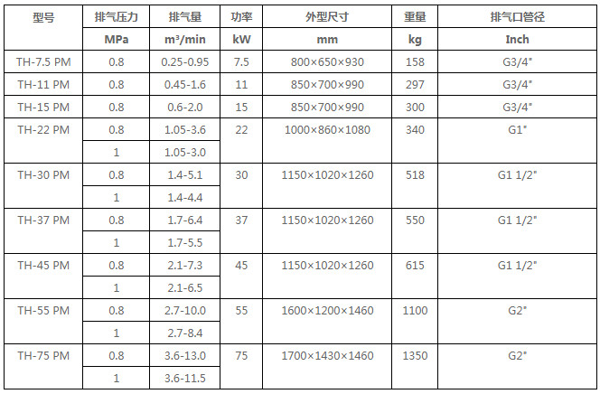 整机特点 添锐TH PM系列永磁变频压缩机装备了高效永磁电机,节能性能卓越,运行平稳,噪音低,使其能在用气点就近安装。
