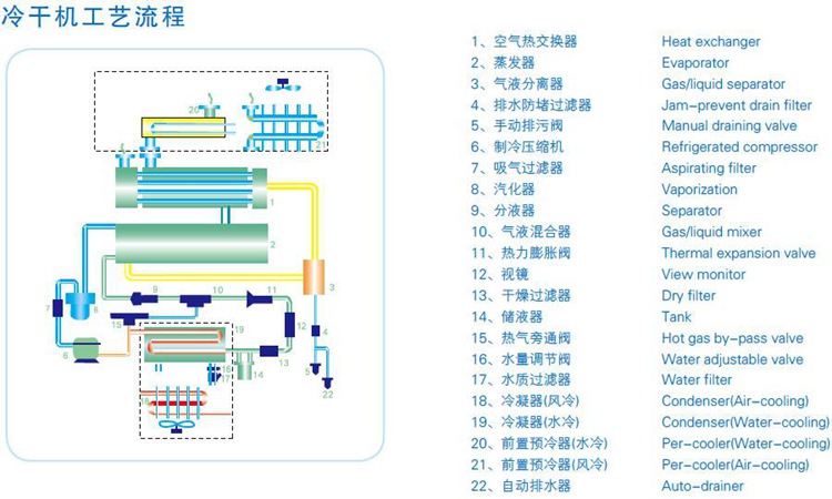 冷冻式干燥器分为风冷标准型(低、高温型)、水冷标准型(低、高温型)、特殊型(高温,高压、低压、深冷、防爆等)处理量从1.7m3/ min到500m3/min:压力露点2-10℃:控制方式有仪表、电子、 PLC 等多种。电源220V/1ph/50H•、380V/3ph/50Hz、110V/1ph/60H•、440V/3ph/50Hz,空气系统有不锈钢外筒体、铝外筒体,还可以生产深冷干机、冷水机、冷却器等,可为您定制各种特殊要求的产品。